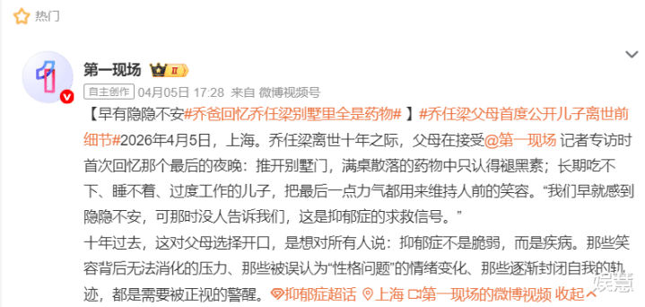 时隔十年,乔任梁父母忍痛再揭伤痕,是想对统共东谈主说:抑郁症不是脆弱,而是疾病。那些笑脸背后无法消化的压力,那些被误觉得“特性问题”的心境变化,那些迟缓禁闭自我的轨迹,齐是需要被正视的警悟。