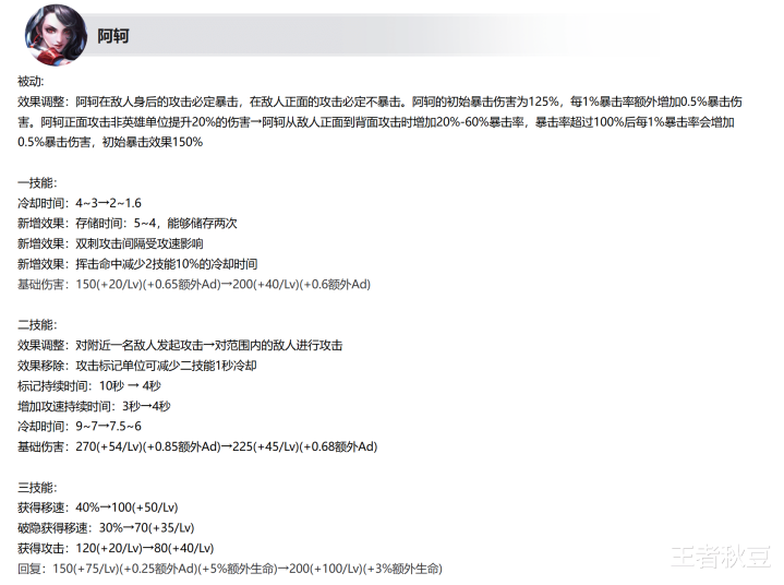 阿轲的改变终于上线体验服。好多东谈主齐知谈阿轲的大约改变,此次主淌若数值的颐养。