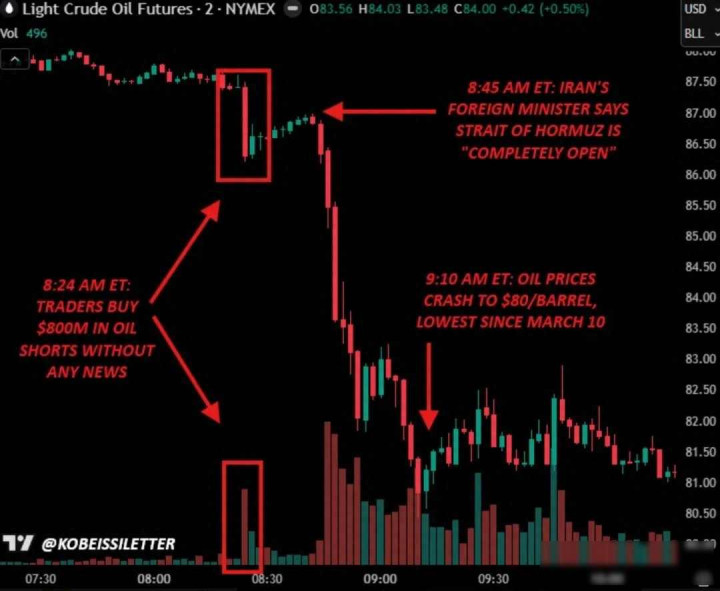 3月23号下昼,特朗普说要推迟打伊朗的油规律,话还没说完,15分钟前就有7.6亿好意思元的原油空单成交了,两分钟内完成来回,今日油价径直跌掉15%,这不是适值,因为4月7号又发生一次,他在晓喻临时停战前几小时,市集霎时出现9.5亿空单,油价再跌15%,到了4月18号周五早上8点24分,莫得任何音讯传出,8亿好意思元的巨额来回骄气,油价跳水,21分钟后伊朗外长说霍尔木兹海峡完全绽开,特朗普在9点06分发帖感谢,WTI价钱跌破80好意思元,这三次都卡在战略公布前的15到30分钟,快得不像靠新闻能跑赢的。