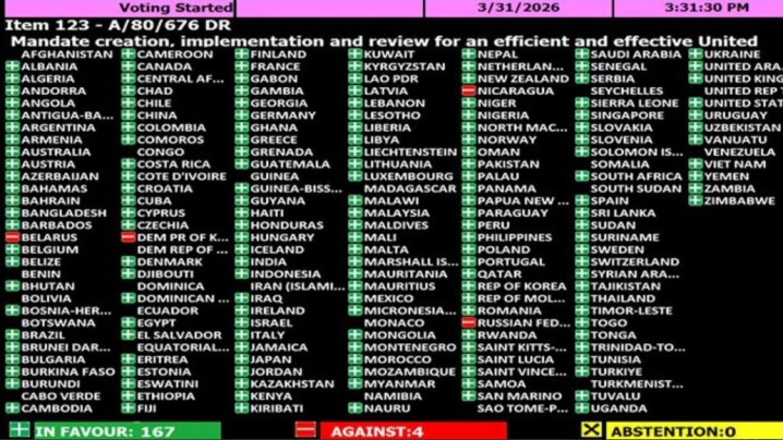 3月31日,结伙国大和会过了一项对于结伙国授权任务制定、实施与审查的立异有狡计,末端很肃穆:168票传颂、4票反对、0票弃权。投反对票的是俄罗斯、白俄罗斯、朝鲜和尼加拉瓜。