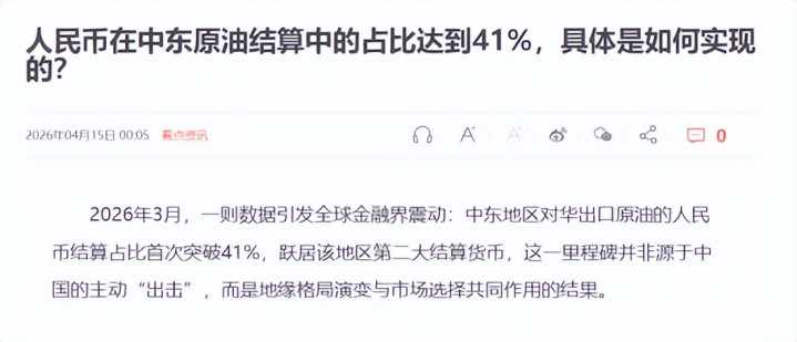 2026年3月,中东地区对华出口原油的东说念主民币结算占比初度冲破41%,跃居该地区第二大结算货币。