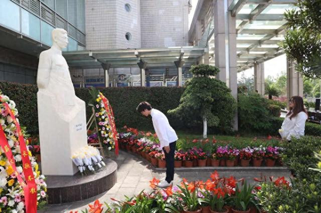4月23日,四川绵阳,中国工程物理斟酌院的后生员工和斟酌生代表向“两弹一星功勋奖章”赢得者郭永怀的雕像敬献鲜花。中青报·中青网记者王鑫昕/摄