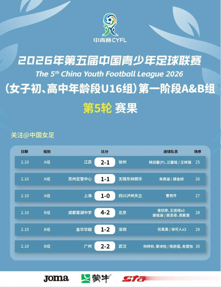 字据《中国青少年足球联赛赛事组织责任决策》和《中国青少年足球联赛竞赛责任决策》条目,中国青少年足球联赛赛事办公室于2026年2月1日至2月10日组织2026年第五届中国青少年足球联赛女子初高中年齿段U16组第一阶段比赛。