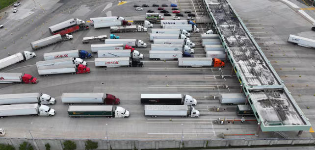 好意思加边境港口交通笨重,卡车列队恭候通关CBC