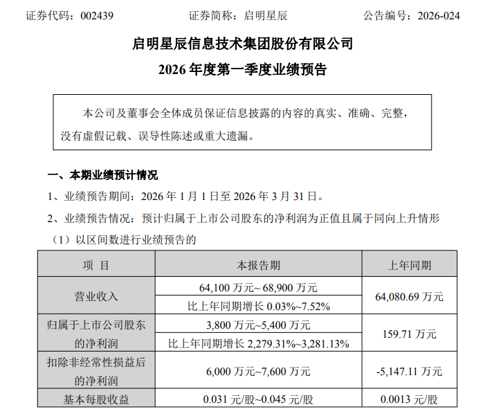启明星辰(002439)量度2026年第一季度达成买卖收入6.41亿元至6.89亿元,同比增长0.03%至7.52%;净利润3800万元至5400万元,同比增长2279.31%至3281.13%。